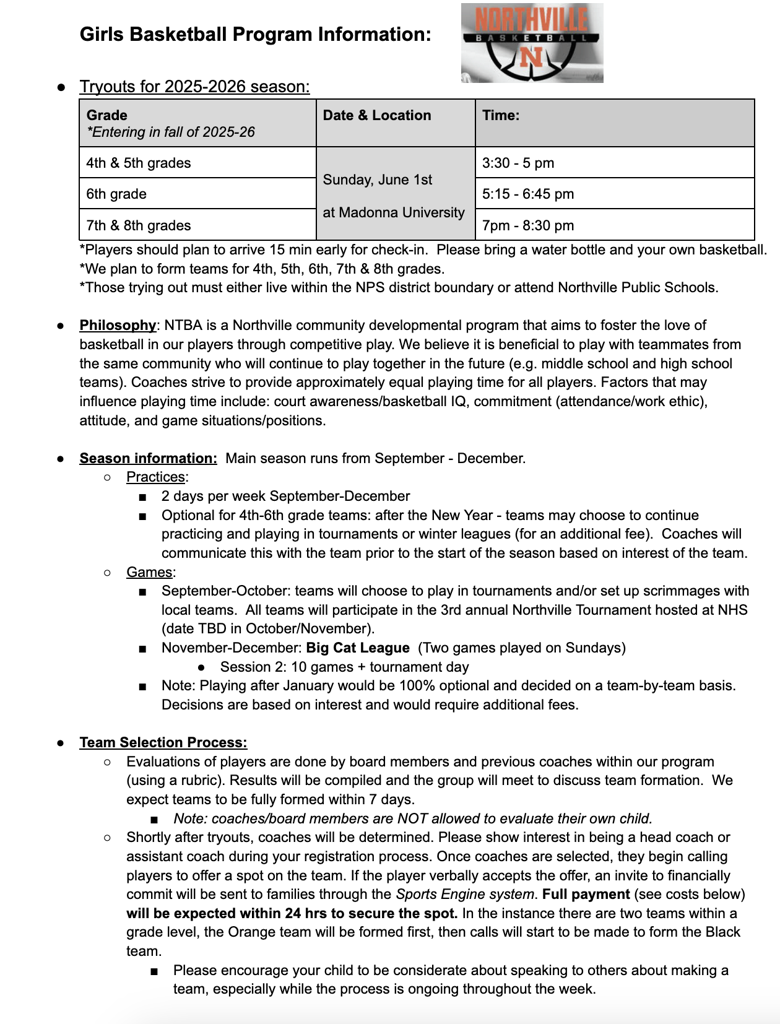 2025 Girls Northville Basketball Tryout Registration